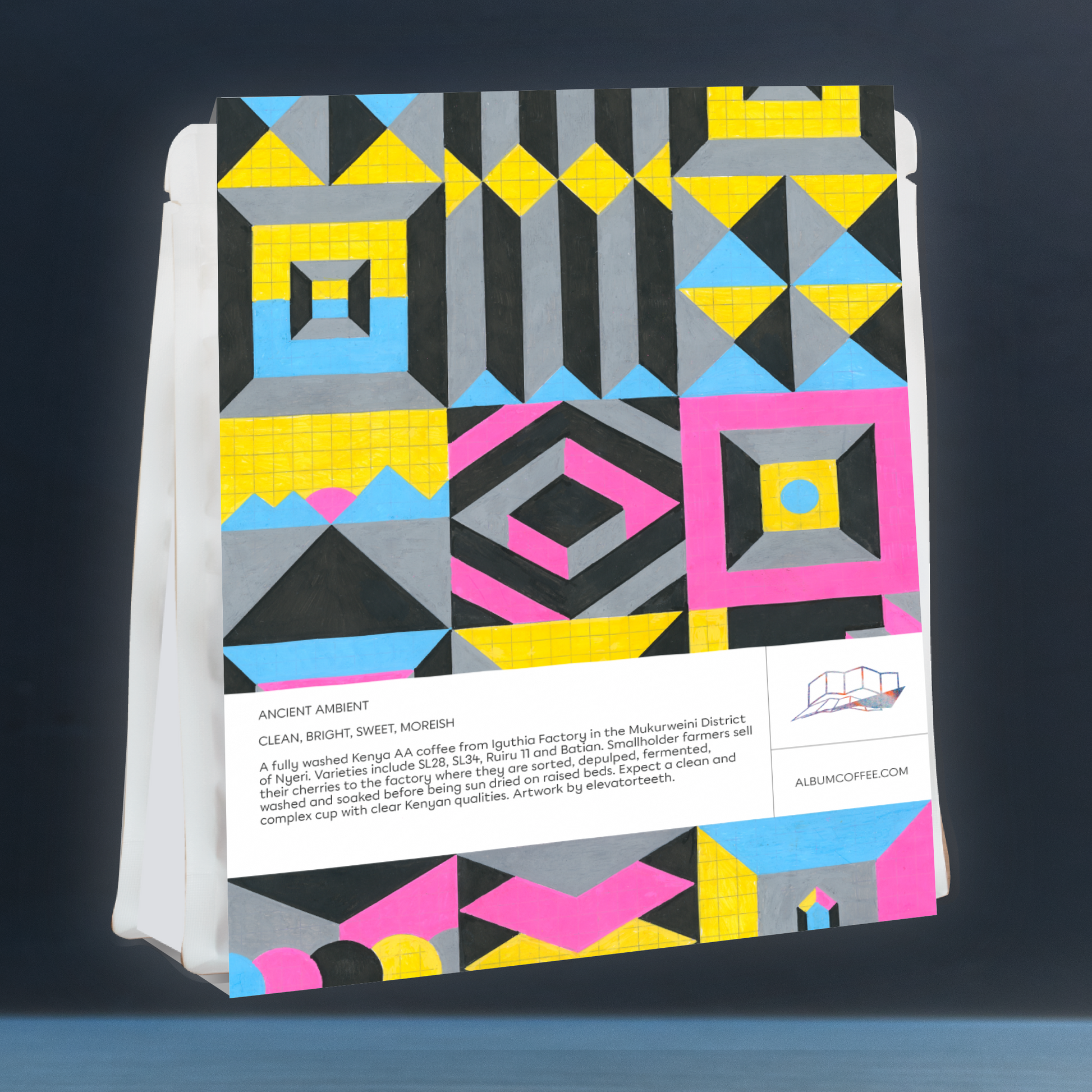 A fully washed Kenya AA coffee from Igutha Factory in the Mukurweini District of Nyeri. Varieties include SL28, SL34, Ruiru 11 and Batian. Smallholder farmers sell their cherries to the factory where they are sorted, depulped, fermented, washed and soaked before being sun dried on raised beds. Expect a clean and complex cup with clear Kenyan qualities. Artwork by elevatorteeth.